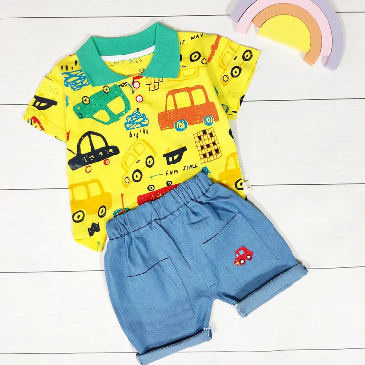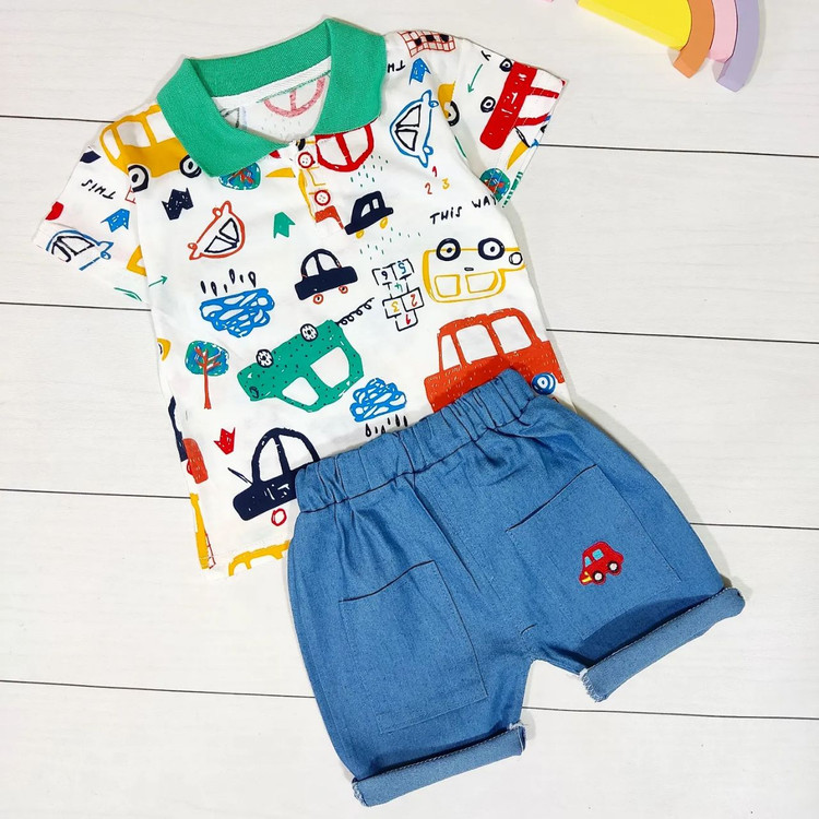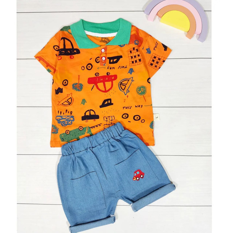 تیشرت یقه دار نخ پنبه و شلوارک جین کاغذی 🍃